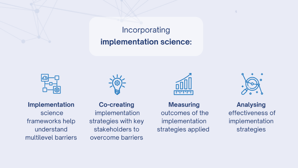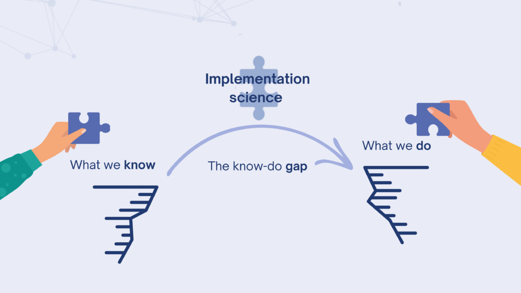 This is where implementation science steps in. As the scientific study of methods and strategies that facilitate the uptake of evidence-based practice and research into regular use by practitioners and policymakers, implementation science seeks to systematically close the gap between what we know and what we do (often referred to as the know-do gap) by identifying and addressing the barriers that slow or halt the uptake of proven health interventions and evidence-based practices.