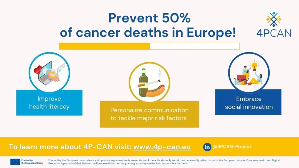 A key objective of the project is to address major modifiable risk factors for cancer (such as smoking, alcohol consumption, physical inactivity, excess body weight, preventable infections, and environmental pollutants like radon) across Eastern European countries, especially within rural communities. It aims to help citizens and caregivers better understand cancer risks, take part in prevention efforts, and access reliable information. By empowering communities and strengthening the capacity of local health and social care providers, 4P-CAN contributes to reducing cancer inequalities across Europe.