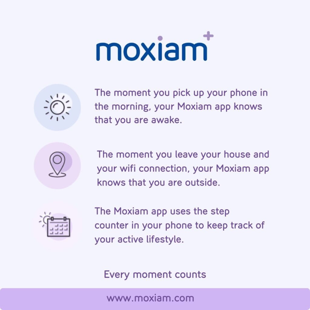 The Moxiam app transforms your smartphone into your digital companion for an active and independent lifestyle without the need for hardware installations at your home. It is based on the functions already present in your phone. There is nothing you need to do other than to just live your life.