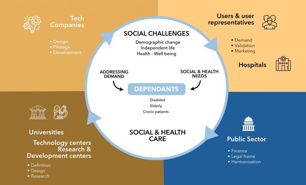 For this reason, the ecosystem brings together a significant number of public and private organizations of the quadruple helix (providers of socio-assistance services, technology companies, university research groups, technology centers and the third sector) with experience in the design, development and application of innovative technological solutions in the fields of active and healthy aging, mental health, disability and independent living. It has a strong representation in the area of social services, the field of dependence and care as spaces to deploy the great potential of person-centered technology thereby contributing to the social and economic development of the territory.